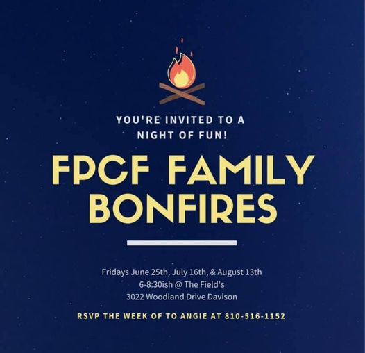 If you’re looking for some summertime fellowship, don’t miss the first of our FPCF Family Bonfires, this Friday evening starting at 6 p.m. All are welcome!